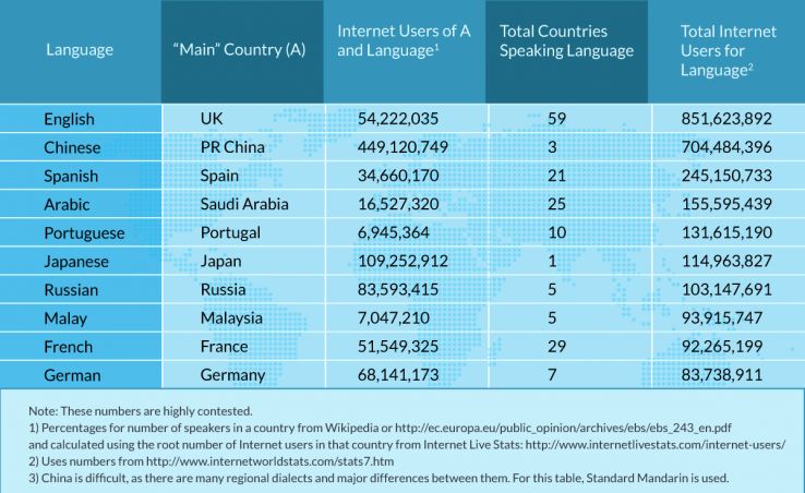 请注意,这不是世界顶级语言列表;这是一个截然不同的清单。此列表基于 Internet 使用情况。并且有些语言只将一个国家设置为官方语言,但其他国家/地区的用户以该语言作为首选语言浏览 Internet。一个例子可能是在美国工作的日本国民设立了一个新办公室。