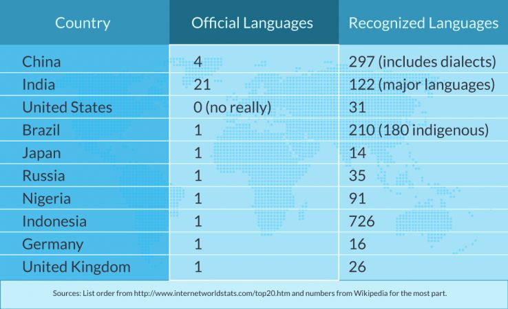 最后,还有一种我称之为“混合”的路线,或者说同时利用地理定位和翻译。如果它们是国际性的,这就是大多数主要零售公司应该做的事情。由于法律、货币、市场变化和文化变化,对地理定位内容的需求很大。但除此之外,还有一些国家需要多种语言版本。一个国家可能有一种到几百种使用的语言!以下是使用网络最多的国家/地区以及每个国家/地区使用了多少公认的语言。