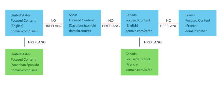 在我解释为什么我不建议在针对国家/地区的子站点之间设置 hreflang 之前,让我先弄清楚一件事。如果您真的专注于国家/地区定位,并且设置还不是那么复杂,那么设置hreflang 不会损害您的网站(稍后会详细介绍)。假设您在加拿大并想开设一个面向美国的网站。您的内容会随着产品的变化、价格的变化和运输信息的变化而变化。您创建 domain.com/us 并将其地理定位到美国。您可以在两个子站点之间相同的每个页面之间添加 hreflang - 例如,两个位置都存在的两个产品。hreflang 不会受到伤害。