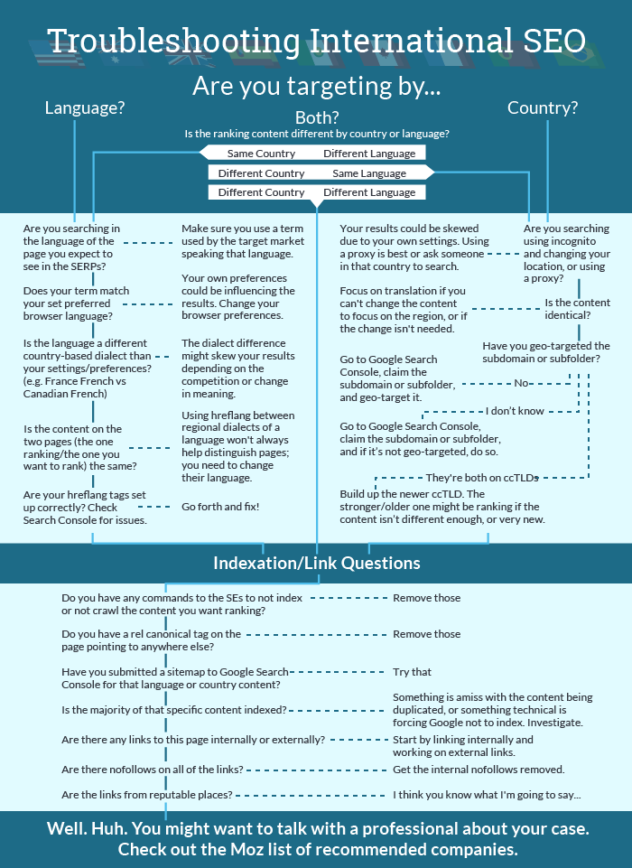 最后是红包!一个流程图,可帮助您解决在 SERP 中错误位置显示的国际列表。您有没有想过为什么您的加拿大页面会向美国用户显示?这将帮助您解决这个问题!